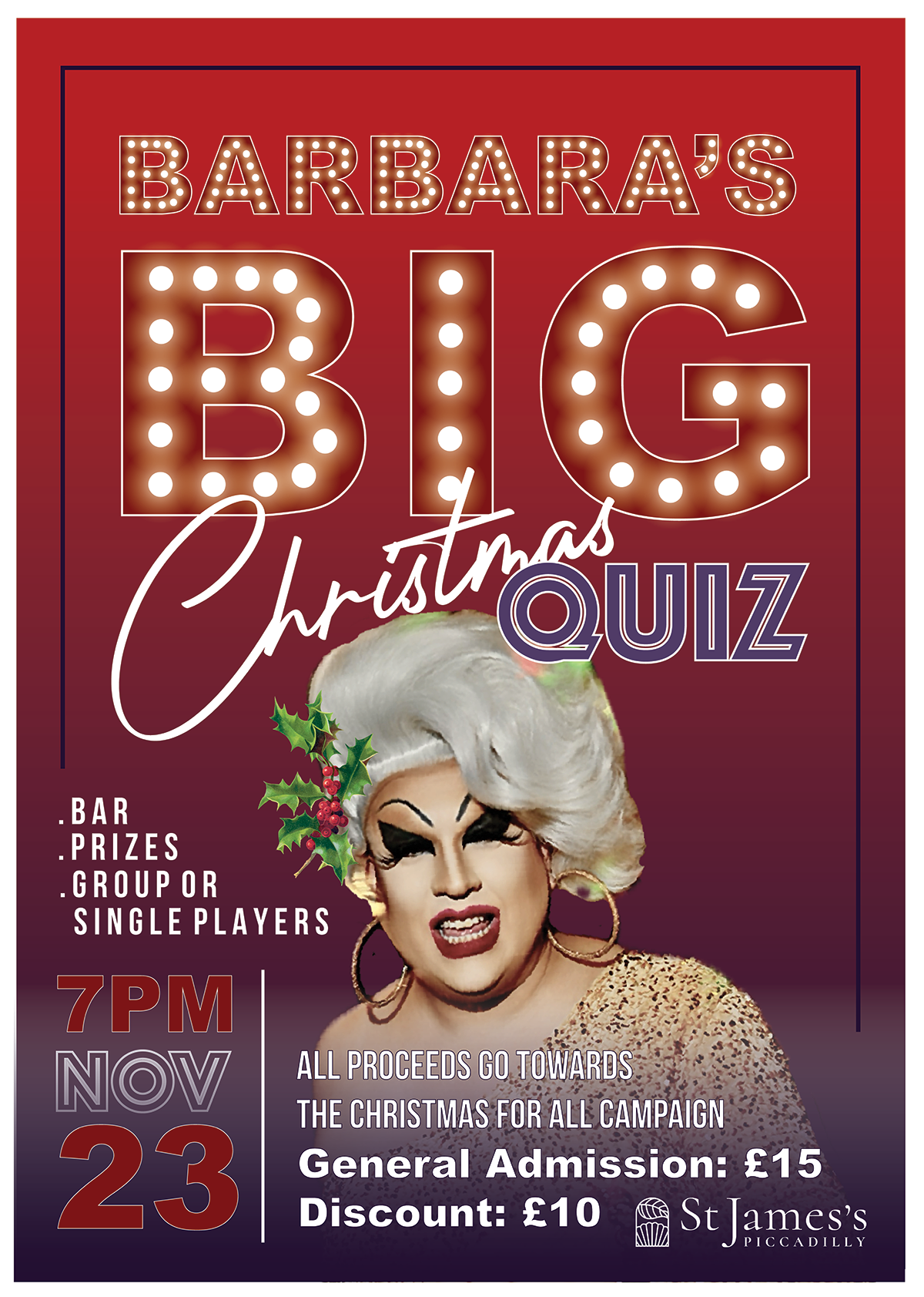 Join your host, Barbara, for an evening of laughter, games, prizes, and festive fun — all in aid of the Christmas for All campaign at St James’s Church, Piccadilly.